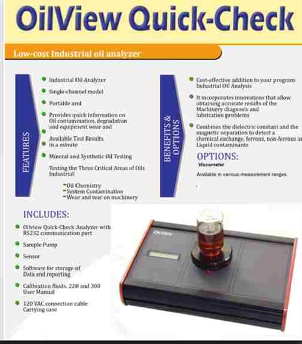 1.OilView Quickcheck Portable oil analyzer : provides useful and fast results to help you solve lubricant related problems quickly using Trivector concept .